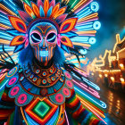 A vibrant figure adorned in a dazzling, illuminated costume with bright colors and intricate patterns stands amidst a festive atmosphere, showcasing a unique blend of culture and celebration.
