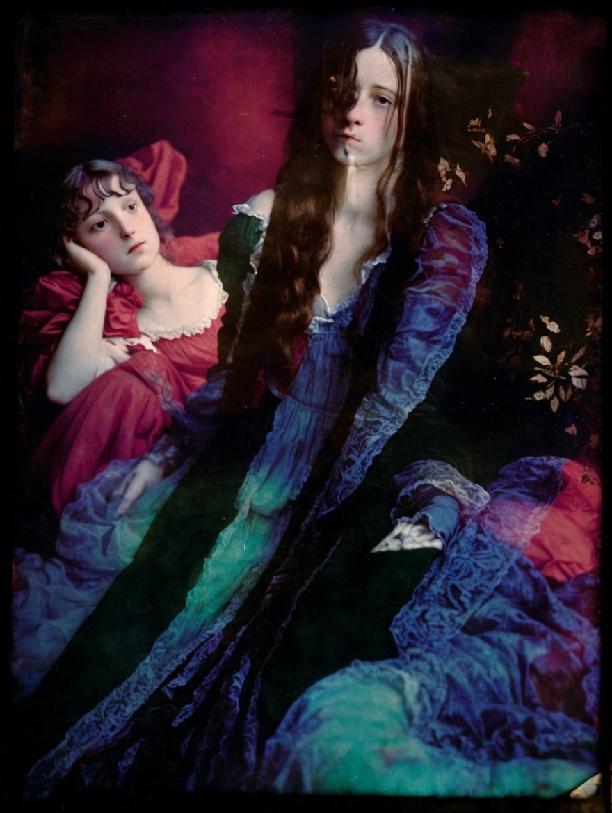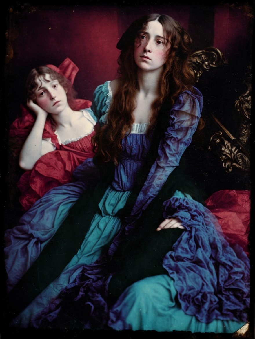 The image features two women in elaborate, colorful dresses with ruffled sleeves. One looks contemplative while the other gazes off to the side, framed by rich, dark backgrounds.