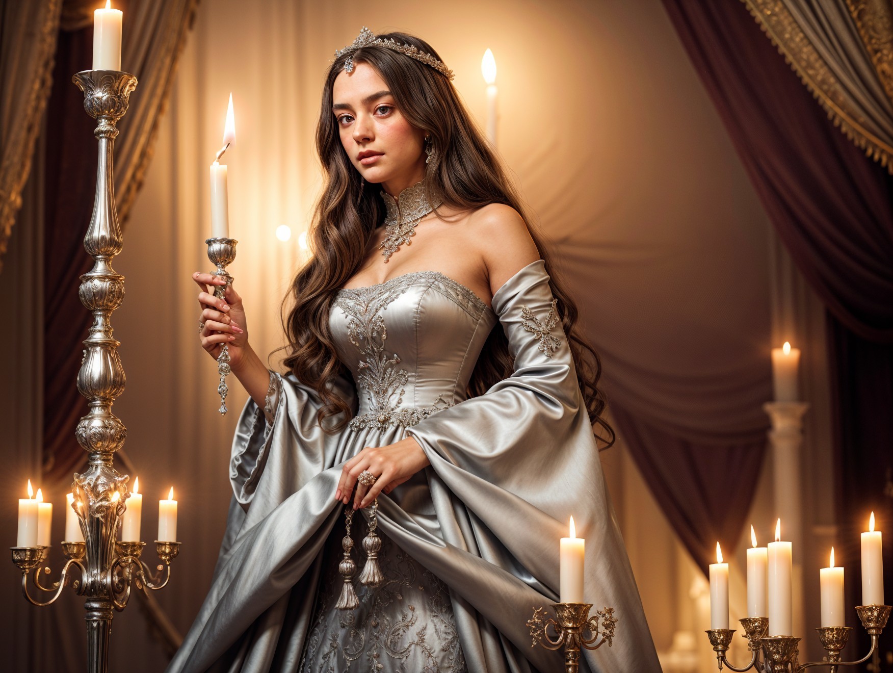 A young woman with curly hair stands elegantly holding a silver chalice, surrounded by soft candlelight. She wears a flowing gown and gazes thoughtfully, creating a serene, enchanting atmosphere.