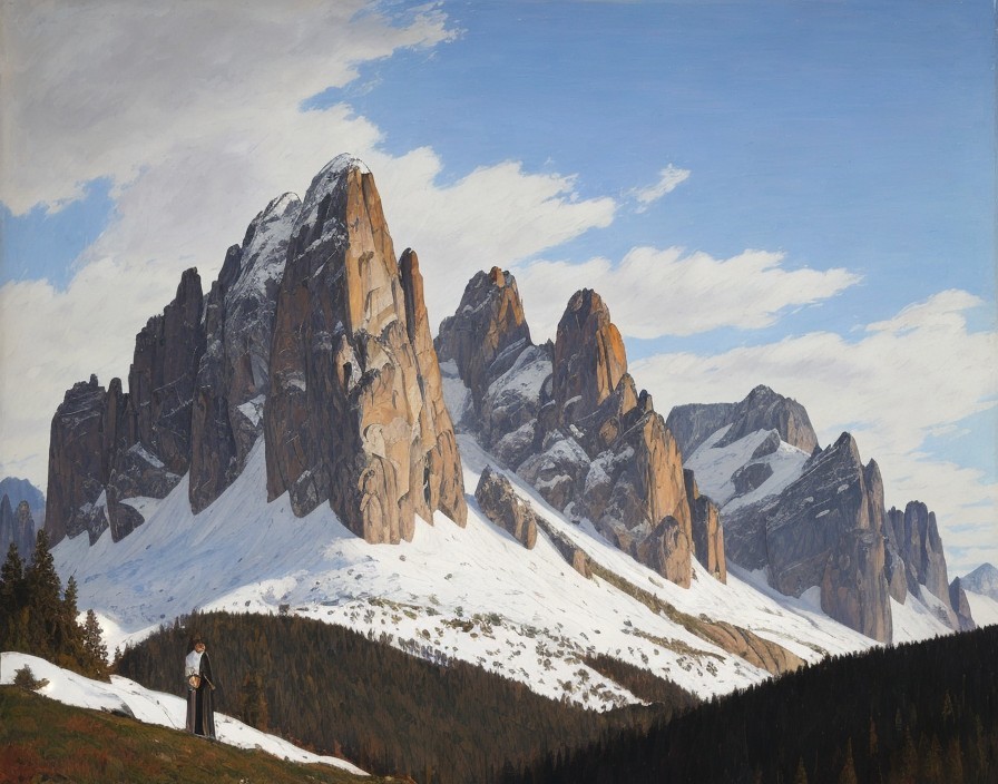 Two figures admiring a majestic mountain range under a cloudy blue sky in a painting.