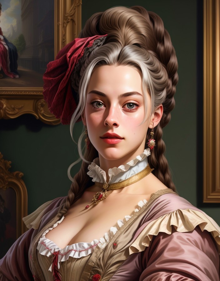 A portrait of a woman with a high updo hairstyle, wearing a regal 18th-century dress with gold jewelry, set against a classic painting backdrop.