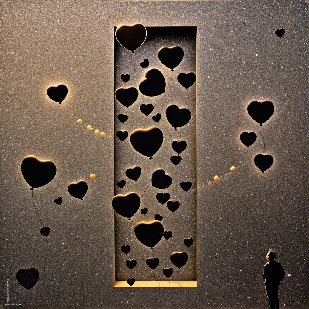 A cosmic scene features an ornate frame in space, from which floating black heart-shaped balloons descend. Stars and galaxies create a magical, dreamy backdrop, evoking love and wonder.