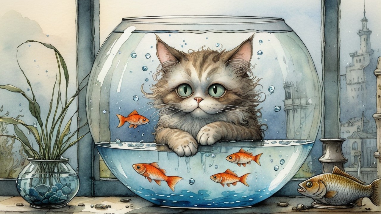 A whimsical cat with big, expressive eyes lounges in a fishbowl, surrounded by playful goldfish. The scene includes a cozy window view and plants, blending fantasy and charm.