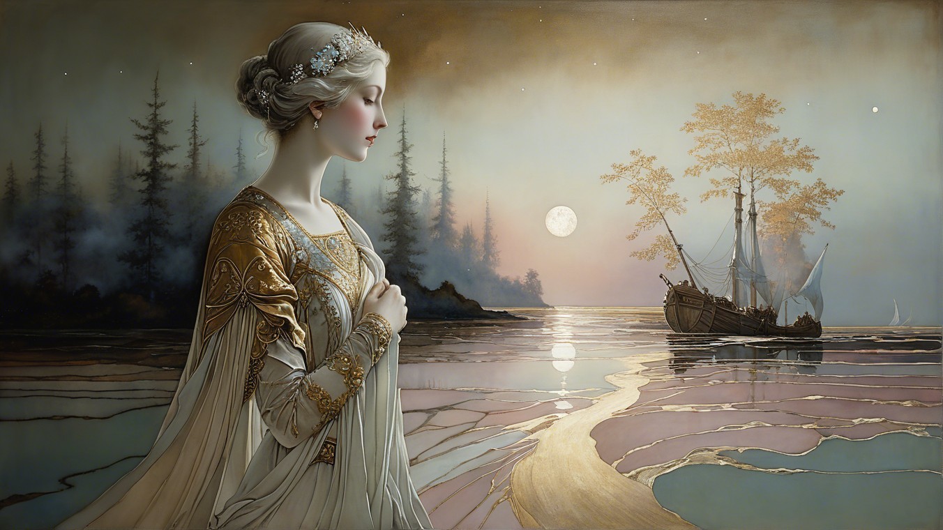 A serene, ethereal woman in ornate attire gazes thoughtfully towards a tranquil landscape, with a soft moonrise illuminating a distant castle and calm waters. The atmosphere is dreamlike and mystical.