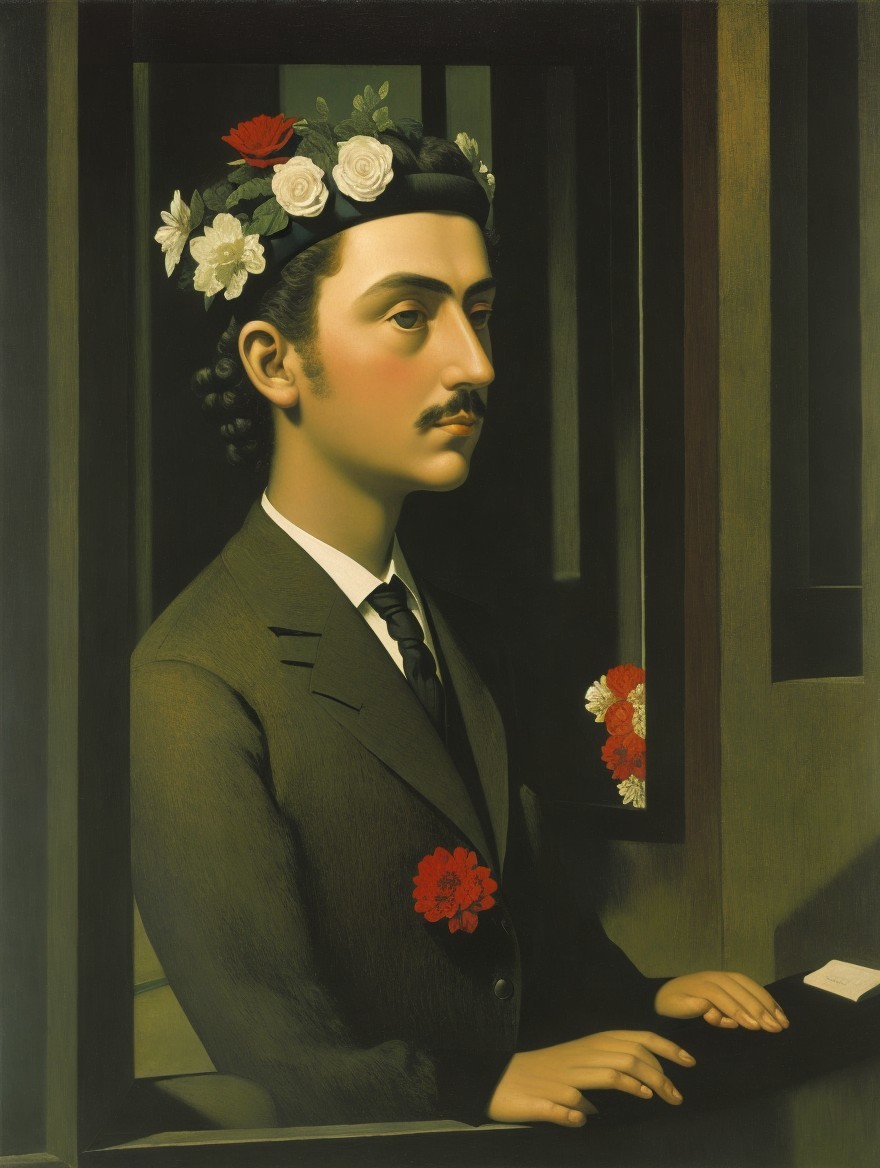 A portrait of a man with a prominent mustache and slicked-back hair, dressed in a black suit, leaning on a windowsill with a landscape in the background.