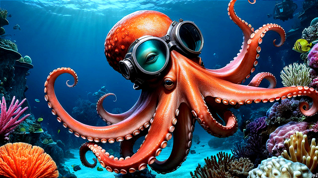 An imaginative underwater scene featuring a vibrant orange octopus wearing diving goggles, surrounded by colorful coral reefs and illuminated by beams of sunlight filtering through the water.