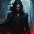 A haunting figure stands in a fiery landscape, shrouded in shadows. With piercing red eyes and flowing dark hair, they exude an eerie, supernatural presence against a moonlit backdrop.