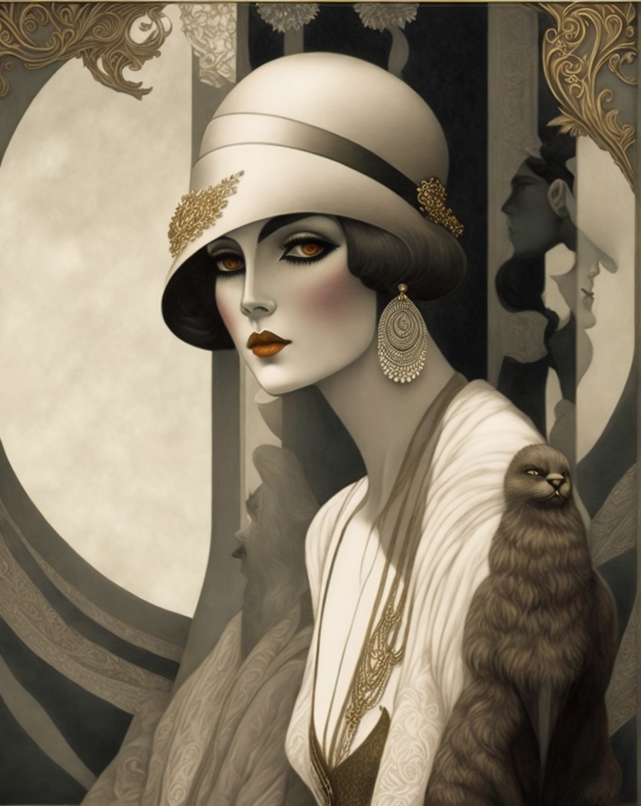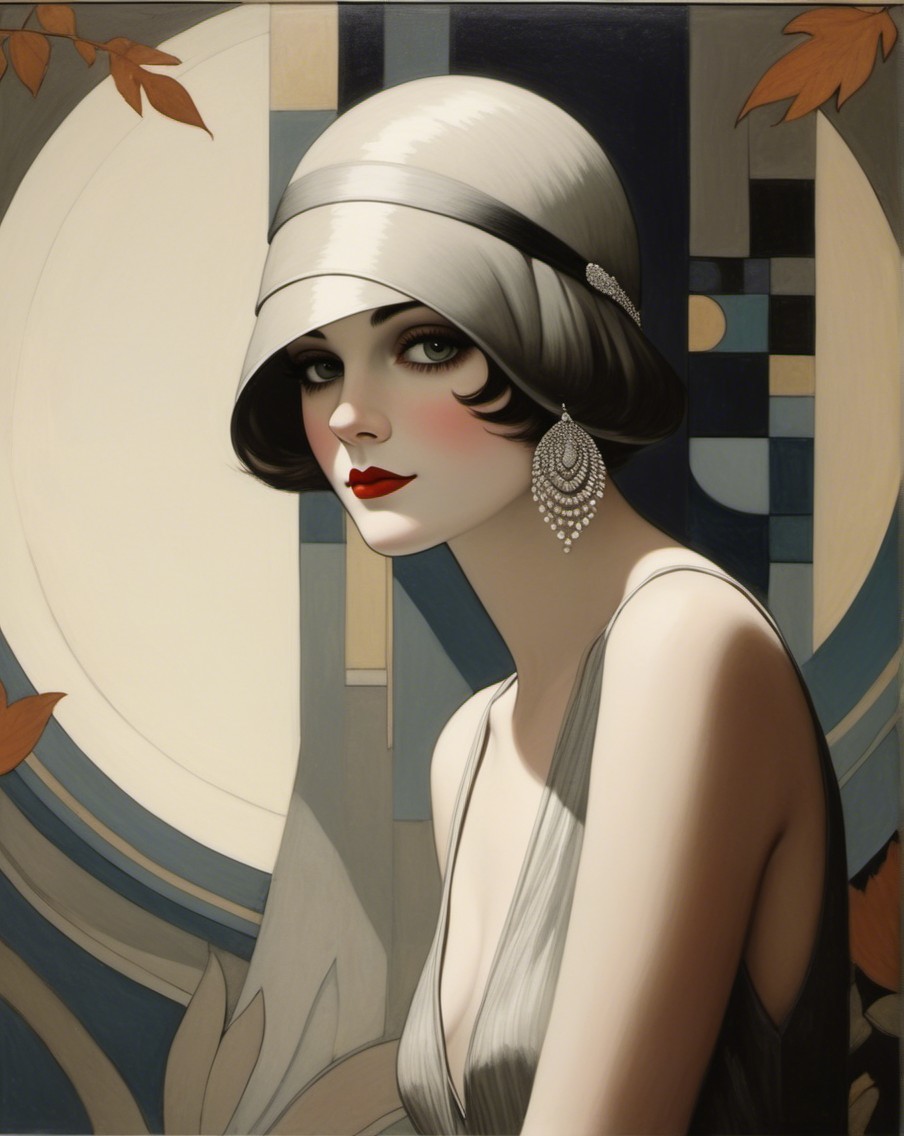 The image features a glamorous woman from the 1920s, wearing a stylish cloche hat and elegant gold dress. She has bold red lips and pearl earrings, exuding classic vintage allure against a soft backdrop.