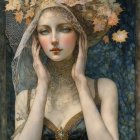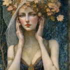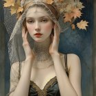 A young woman with golden hair, adorned in a green dress, gently touches her face. She wears a delicate veil decorated with leaves and a spider web, evoking a mystical, autumnal atmosphere.