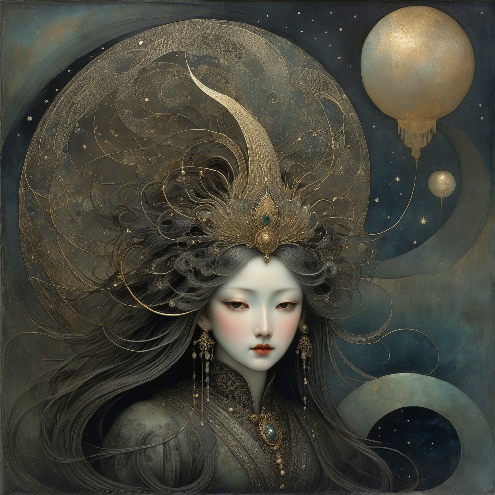 A serene, ethereal figure with long black hair, adorned with an intricately designed horned headdress and elegant jewelry. The backdrop features a glowing moon and distant silhouettes of ancient architecture.