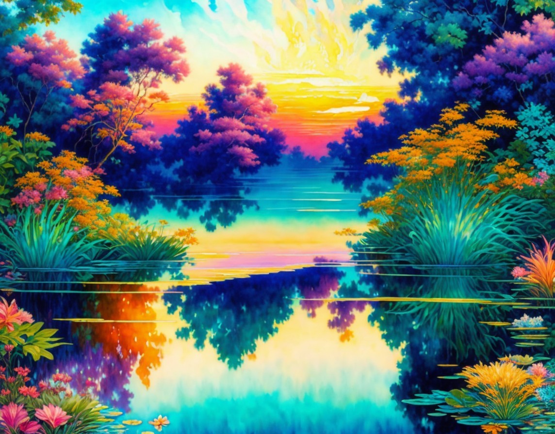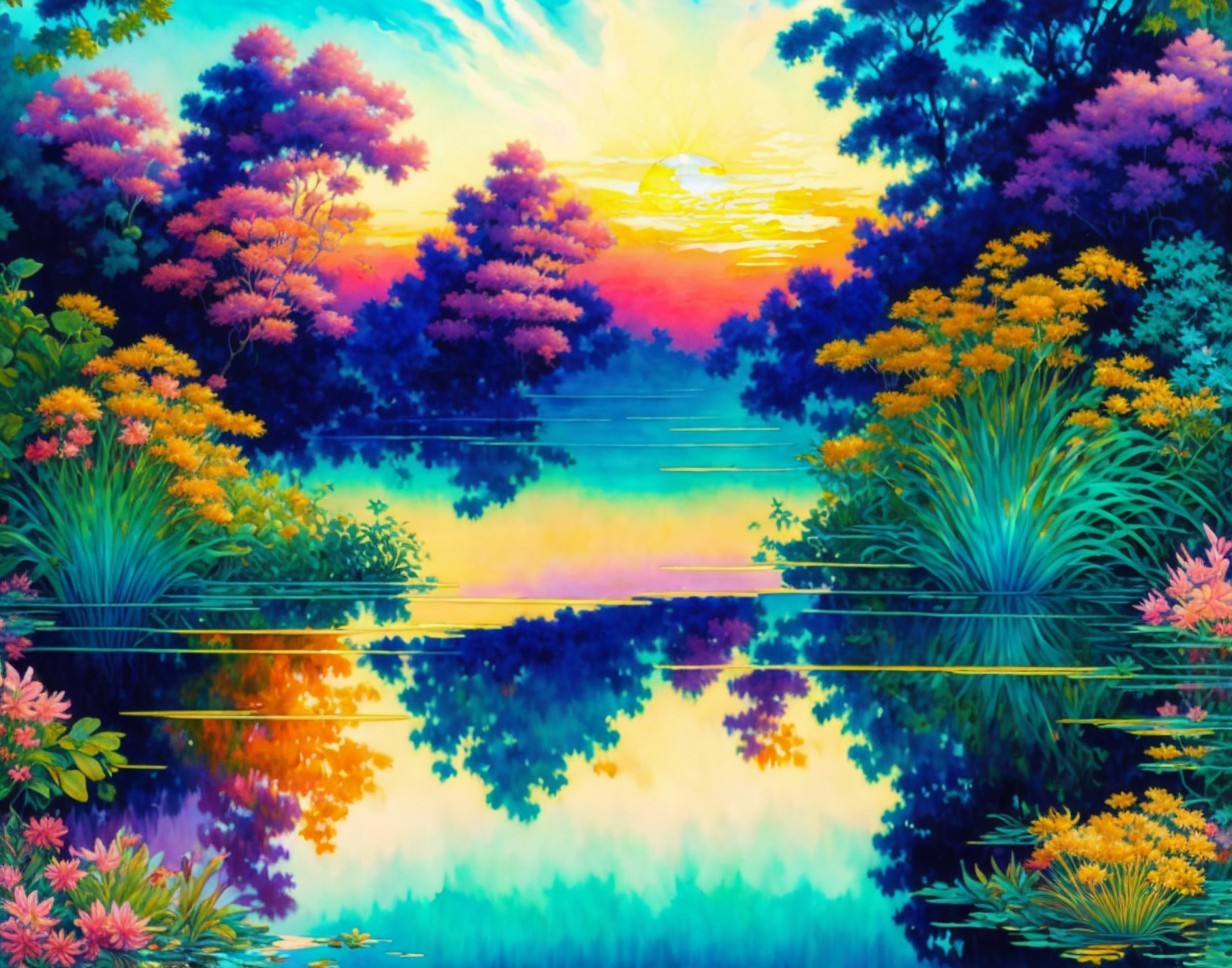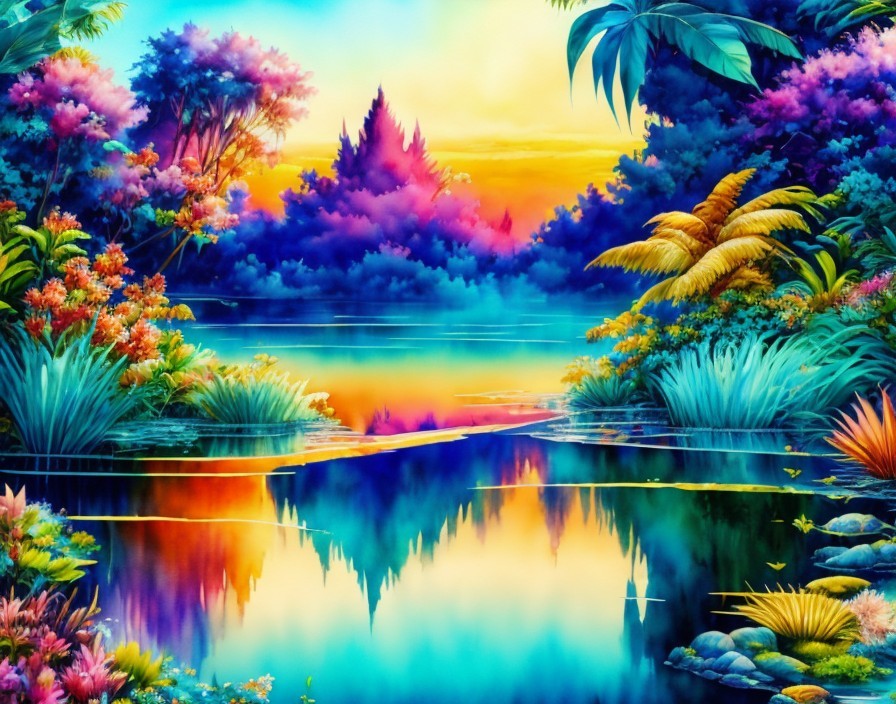 Prompt: "Full page, single image, 3D watercolor patchwork, spectacular sunrise, turquoise colored rippled stream reflecting tropical flowers with vibrant saturated colors, trees and plants with leaves in shades of azure blue and teal, golden sunrise rays shimmering over the scene, intricate, satiny, high quality, elegant, highly detailed, glistening magic style, with elements in the very best style of Gustav Klimt, with elements in the style of Jan Toorop, with subtle elements in the style of Tingatinga"