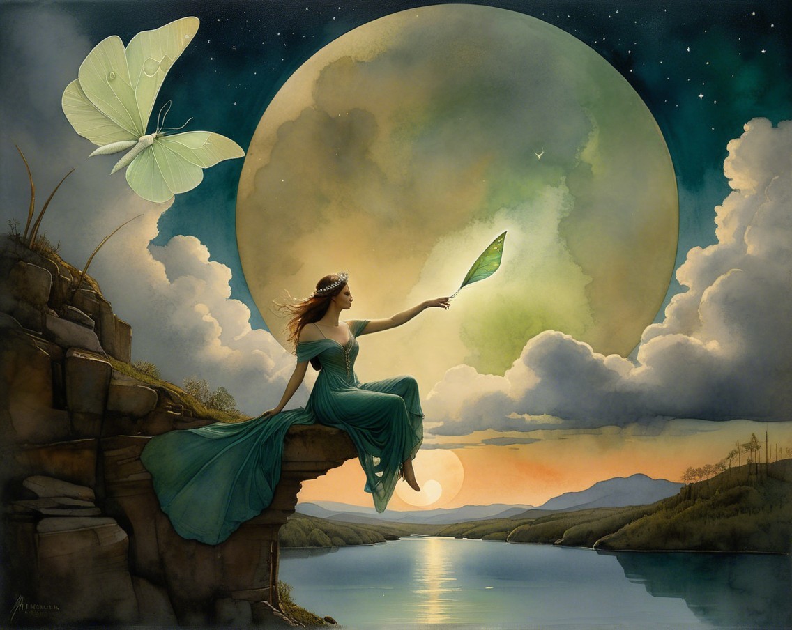 watercolor delicate sobriety fine lines in shades of gray and green watercolor and ink by Anton Mauve and Enki Bilal. Iridescent watercolor and ink By Jamie Heiden, Daniel Merriam, Paul Klee, Karol Bak, Dee Nickerson, extremely detailed, high definition, crisp quality, ultra detailed background . Close up, ghostly amused beautiful Amazonian Luna moth goddess in a jungle dreamscape in the style of Alexander Jansson. by Catrin Welz-Stein, Michael Parkes 3d, extremely detailed, beautiful, watercolor and ink, mixed media, Best quality, Very high definition, super clear resolution, cinematic, intricate, fantastic view, beautiful, dynamic lighting, high definition, hdr *Random prompt award winning Max Ernst ultra detailed, 4K 3D