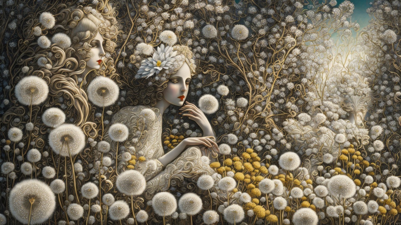 The image features three elegantly dressed women surrounded by dandelions, blending Art Nouveau style with ethereal elements. Their intricate headpieces and serene expressions evoke a dreamlike atmosphere.