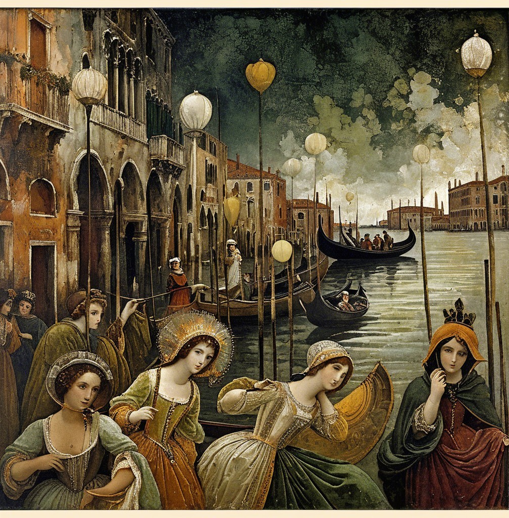 A serene Venetian scene features women in elegant 16th-century attire by a canal, surrounded by historic buildings and gondolas, under soft lantern light. The atmosphere is both romantic and timeless.
