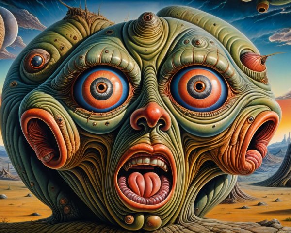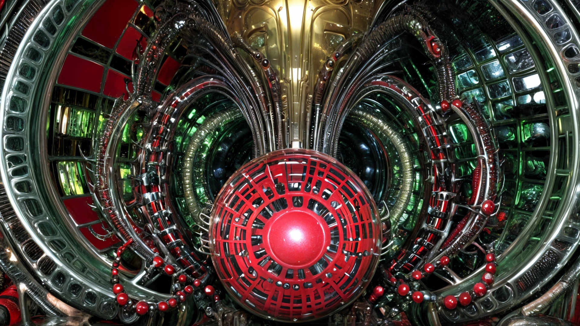 A striking, mechanical face featuring a red circular design with glowing green eyes and ornate metallic elements. Intricate gears and tubes create a steampunk-inspired, otherworldly aesthetic.