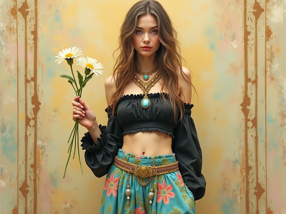 (A realistic, stunning blonde woman with loose, messy hair, holding a yellowish-white daisy, centered, created with copper patina and iron rust, vintage vibe, muted pastel color palette of turquoise, blue, mossy green, red, patina, and gold, style of Paul Klee and Arthur Rackham. Misty, irregular, messy patchwork backdrop.) (Double exposure: A visible golden wire net covering the entire canvas, including the woman.) By ©LoveCat New Wave."Create a captivating, realistic portrait in a modern, bohemian, high-fashion style. Depict a lovely young woman with long, straight dark brown hair and a very narrow waist. Capture her in a graceful, full-body standing pose. Her skin has a soft, glossy, oiled sheen. She wears a unique multi-element outfit: high-waisted, extremely wide-leg, flowing palazzo pants made from a fabric with a multi-colored tie-dye pattern in shades of blue, pink, and yellow. Paired with a simple, fitted, black, off-the-shoulder, long-sleeved crop top. An ornate, golden belt cinches her very narrow waist. She wears numerous layered gold necklaces with large, blue stone pendants.\n\nThe background is a soft, abstract, out-of-focus and atmospheric painting, with textures of yellow, pink, and brown. The scene is lit by a warm, golden backlight. The scene is captured in a photorealistic style with ultra-detailed, high-resolution clarity. Incorporate elements of medieval, baroque, and renaissance aesthetics, emphasizing féminité and grâce. Add glamour and aesthetic inspiration from Soufiane Idrassi and Edwardian Avant Garde fashion.\n\nFor an additional layer of complexity, imagine a vibrant and colorful bohemian fashion photoshoot featuring a woman wearing a stunning turquoise dress with intricate floral embroidery and beadwork. The dress is adorned with detailed patterns in pink, orange, and green hues, with tassels and lace trimming adding to the elegant design. She is accessorized with large turquoise statement earrings and a multicolored beaded necklace.\n\nHer hair is styled in a voluminous updo decorated with bold orange and pink flowers, complemented by green feathers. The setting features a pastel turquoise background with a rustic door, creating a tropical and artistic atmosphere. The overall mood is lively, exotic, and full of intricate details, with a sensual mood and soft lighting.\n\nApply an infrared filter (1.8) to enhance the glamorous and aesthetic appeal. Ensure the final image is a masterpiece, best quality, with a captivating portrait revealing clothes, sensual, and a low-key background. The overall ambiance should evoke magic and enchantment, capturing the essence of féminité and sensual allure."