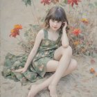 A delicate, ethereal figure sits on a rocky ledge, adorned in a light dress. Surrounding her are vibrant red flowers, creating a striking contrast against the soft background. Her pale features evoke a dreamlike quality.