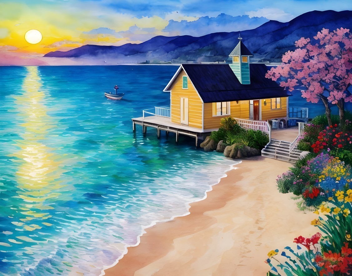 Vibrant beach scene with a sunset, a house, and a pier in the water. The dreamy watercolor painting features a patchwork style with various colored flowers and plants, creating a fantastic and intricate view.