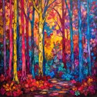 A vibrant mosaic scene features a winding path through trees with bright red foliage, set against a golden background. A charming lamppost adds warmth to the colorful autumn landscape.