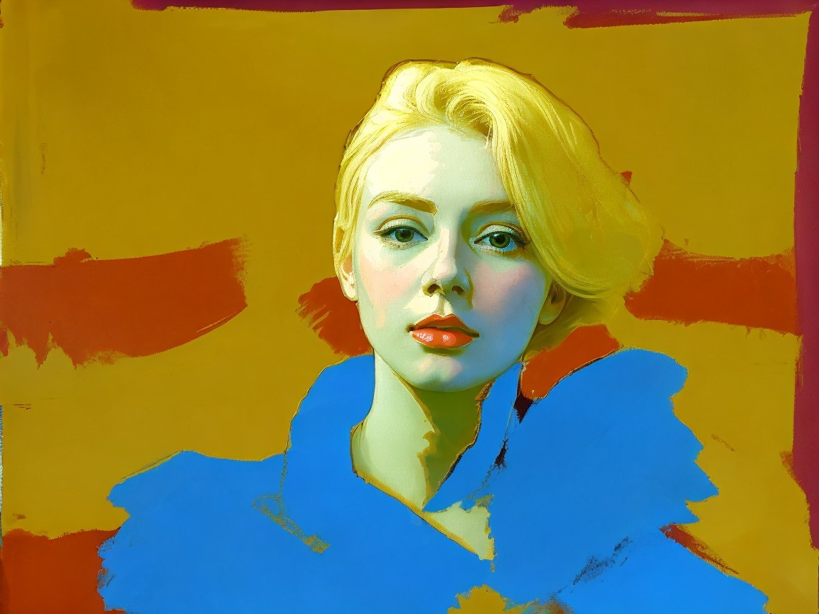 A portrait of an actress with short blonde hair and blue eyes, in dramatic light, wearing an abstractly painted striking blue top, set against a vibrant, abstract background.