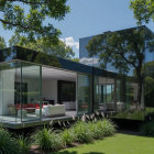 A modern house featuring a sleek, minimalist design with large glass panels, a spacious outdoor patio, and lush greenery surrounding the property, blending seamlessly with nature.