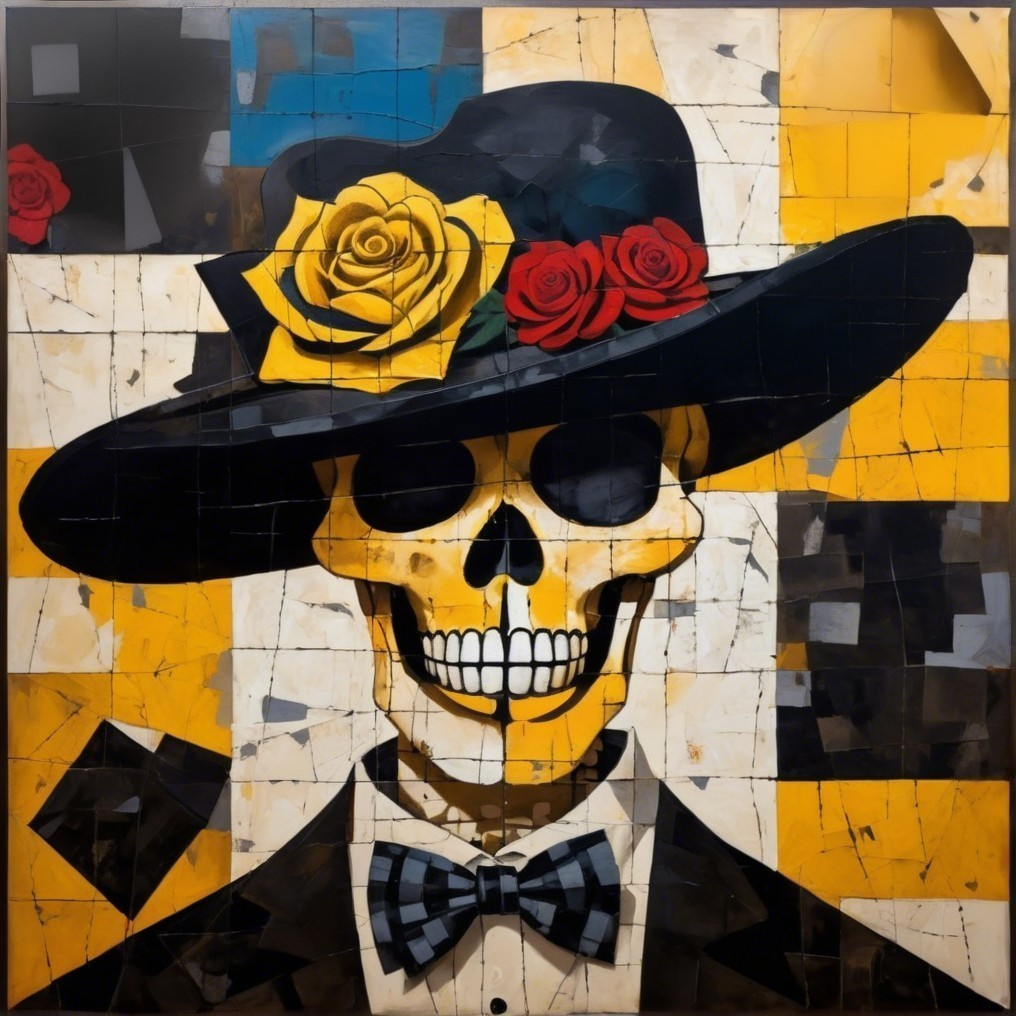 (A modern abstract black and white close angle portrait of a skeleton with a bow tie a panama hat and a bunch of roses) (painting and collage by Francis Picabia and Kurt Schwitters and Andy Warhol)