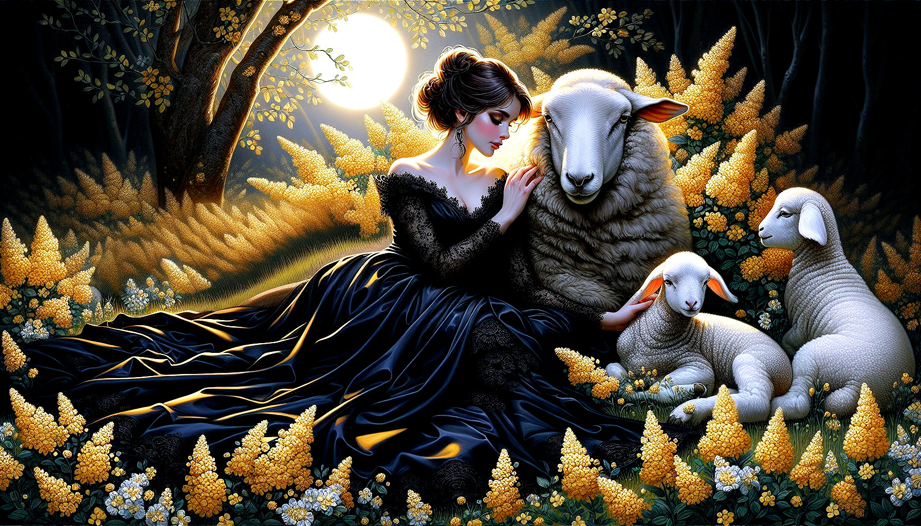 A stunning oil painting depicts a graceful woman in a black satin dress, surrounded by yellow flowers, lovingly interacting with a Spotted Ewe and lamb, showcasing intricate details and vibrant colors.