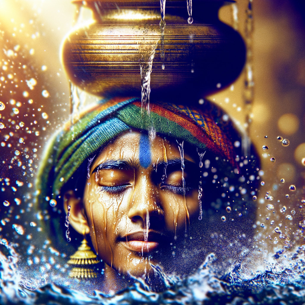Prompt: he saw a girl with a beautiful small brass pot balanced on her head. Little Water was flowing over the brim of the pot and sloshed trickling down her forehead. glistening drops hang in her hair and eyelashes like morning dew. Oh, she was lovely!.