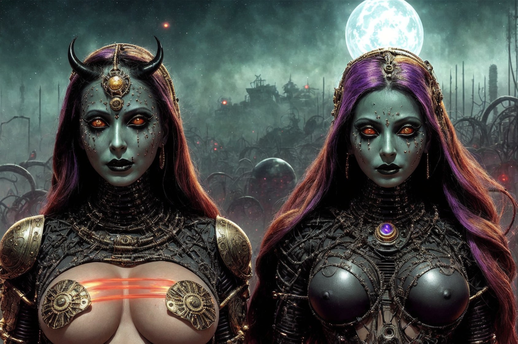 Two fantasy-styled female characters with horned headpieces and mystical armor, in a foggy extraterrestrial landscape with a moon-like orb.