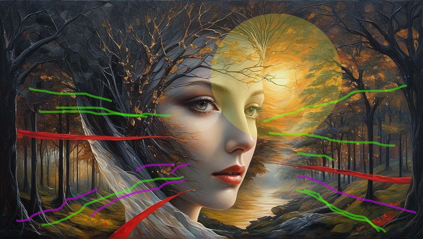 A surrealist painting blending a woman's face with an autumnal forest scene and a winding river reflecting a radiant sunset.