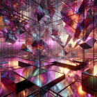 A figure in regal attire sits in a vibrant, modern space filled with glass structures reflecting colorful lights, blending classical and contemporary art styles in a striking visual environment.