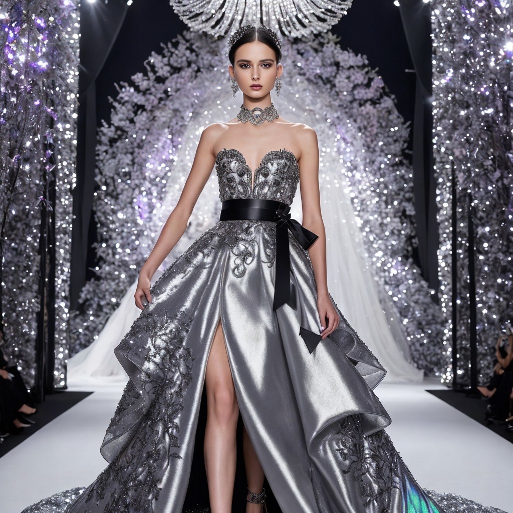A woman models a luxurious silver gown with embroidery and a bow accent on a runway flanked by flowering branches and sparkling curtains.