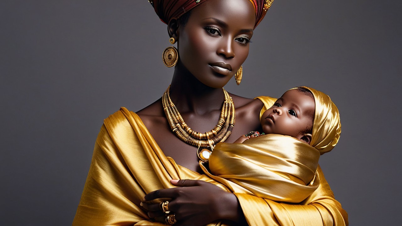 A mother dressed in vibrant golden attire cradles her baby, both adorned with intricate jewelry. The scene radiates warmth, love, and cultural richness, highlighting their close bond. Art created by constance lowery.