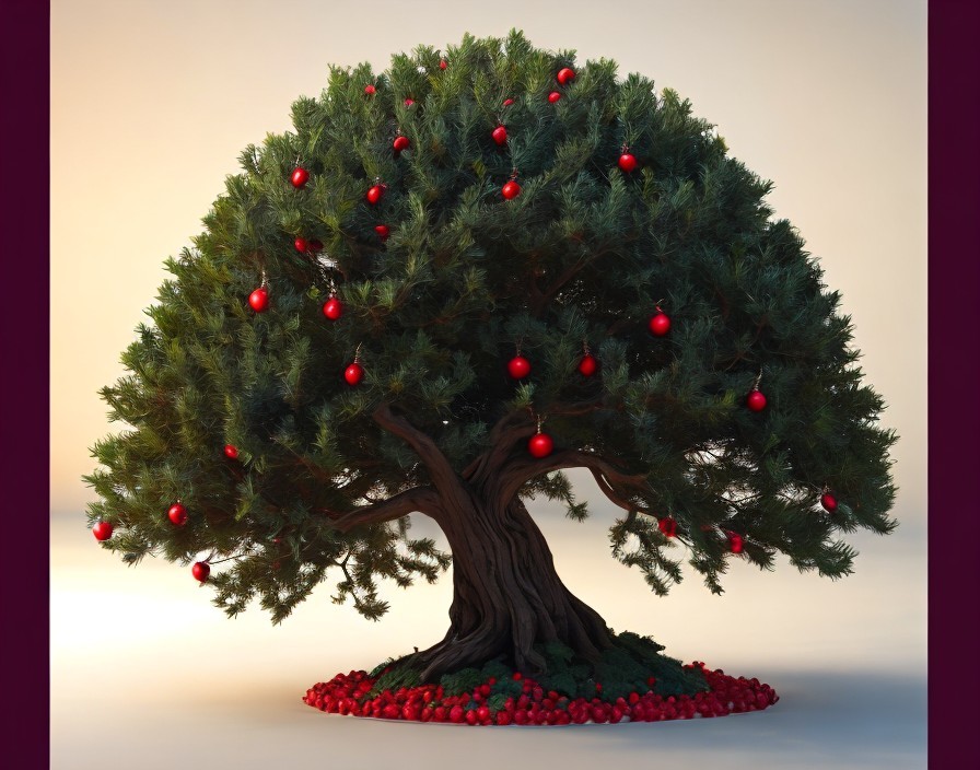 A person in traditional attire sits under a large tree on snowy ground at dusk or dawn.