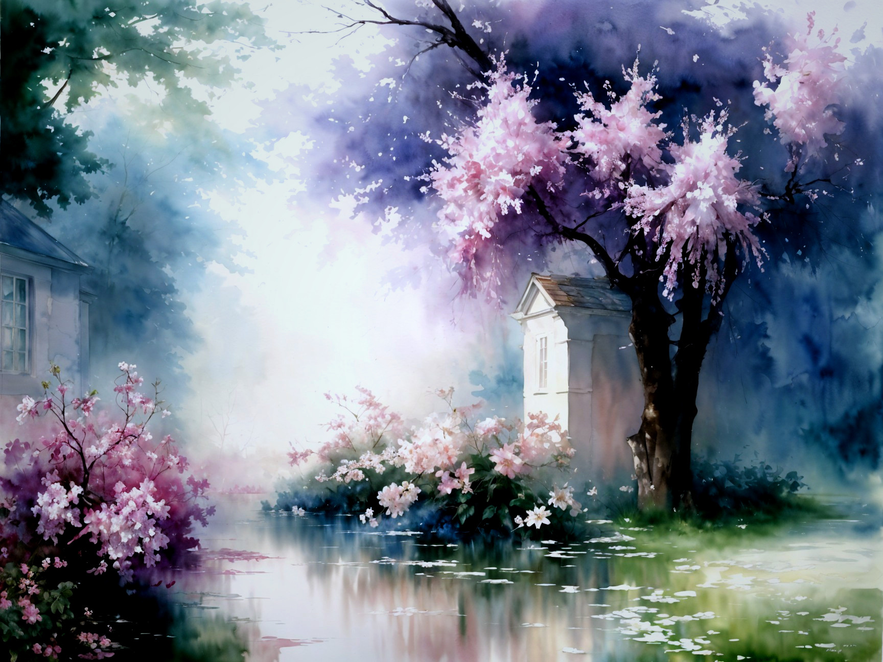A serene landscape features a quaint, white structure beside a tranquil lake, surrounded by vibrant pink and orange trees, immersed in mist and soft pastel hues. Nature's beauty is captured beautifully.