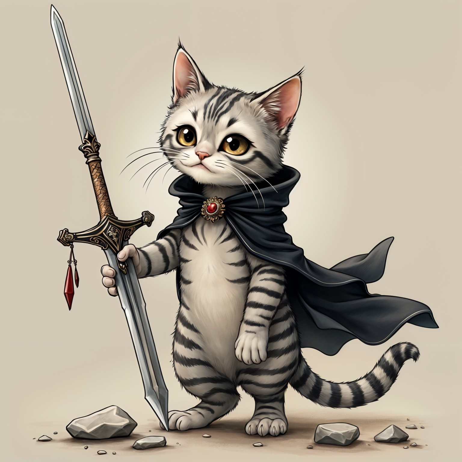 A cute tabby kitten stands heroically with a sword in one paw and a flowing black cape. Its big eyes shine with determination, surrounded by small rocks on a neutral background.