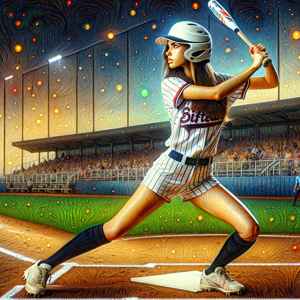 Prompt: At an American softball park, perfect camera view towards home plate where a beautiful young girl, thin, left-handed batter “Slapper Hitter” with long dark brown hair wearing a team uniform is posed to bat, in the style of Norman Rockwell