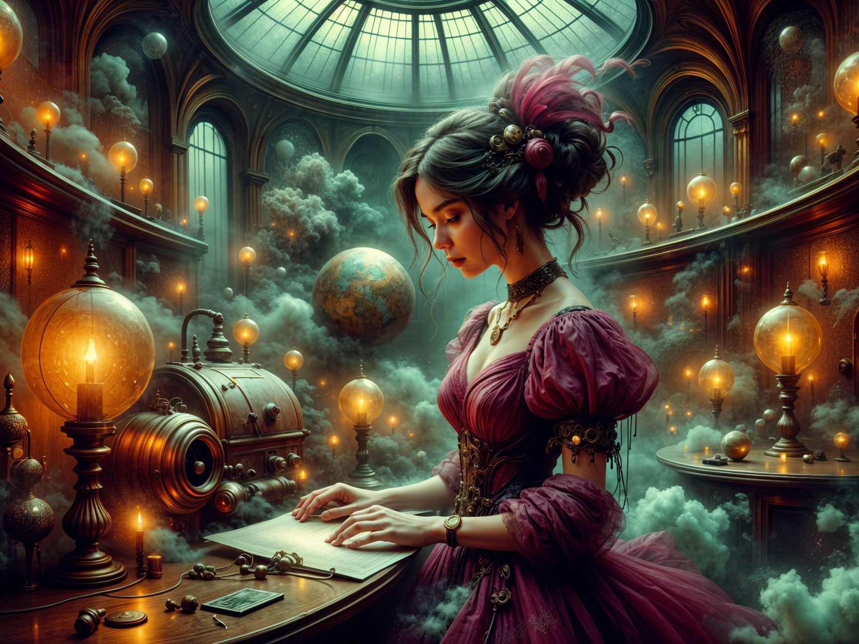 A young woman in a vintage gown studies an open book amidst a mystical library. Surrounded by glowing orbs and historical instruments, she embodies curiosity and elegance in an enchanting setting.