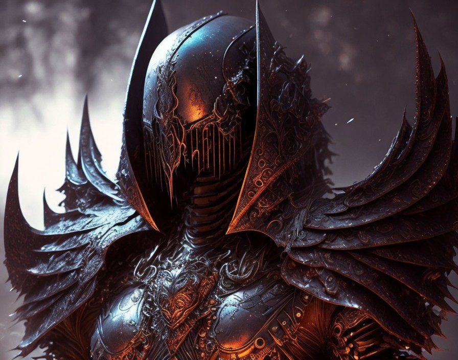 Detailed Illustration: Dark, Fiery Knight in Ornate Black Armor with Wing-like Structures