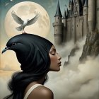 A young girl with a vintage aviator helmet adorned with propellers and goggles gazes into the distance, surrounded by clouds and flying planes, under a large, luminous moon.Original Prompt: Molly Johnston