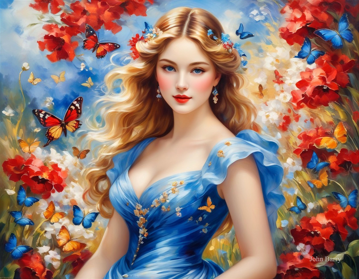 An artwork of a woman with golden hair in a blue dress surrounded by red flowers and butterflies, creating a vibrant, fairy tale-like atmosphere.