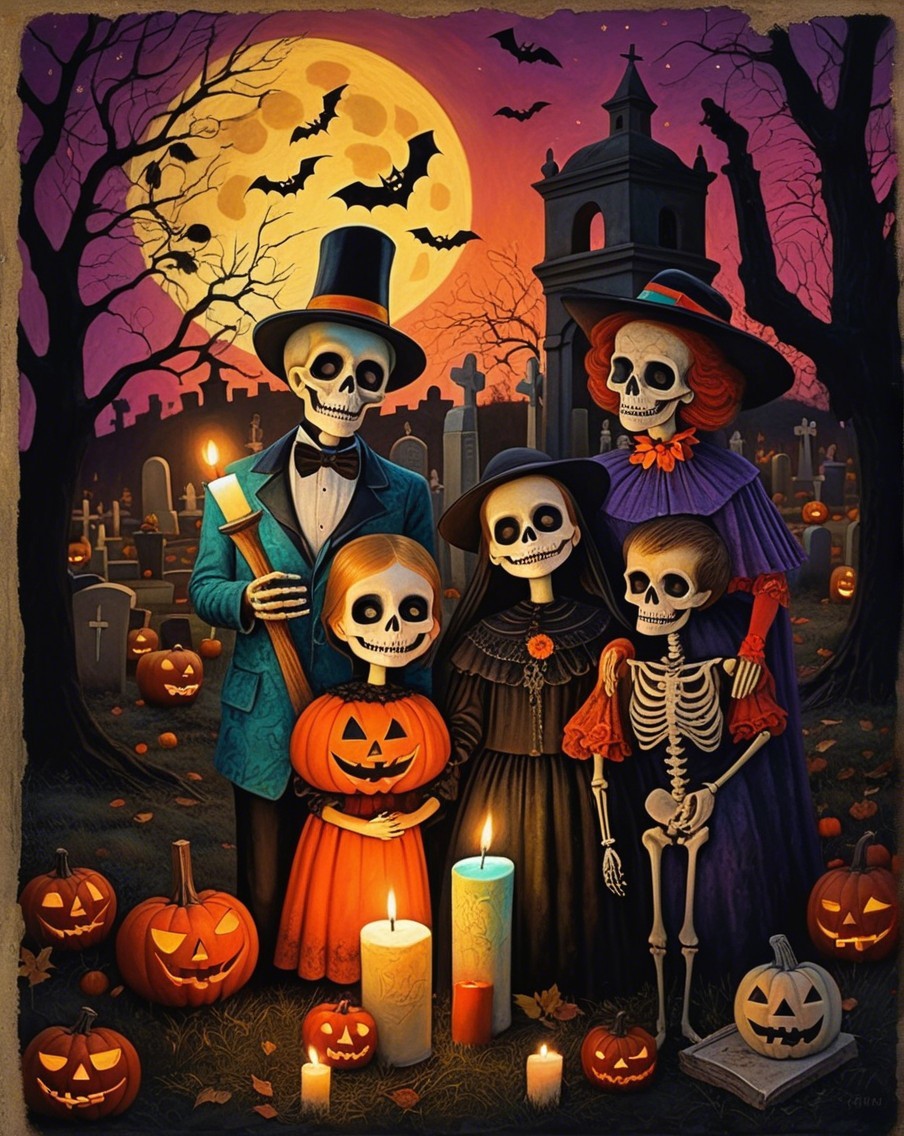 A whimsical Halloween scene features a family of skeletons dressed in colorful costumes, surrounded by pumpkins and candles in a graveyard, with a glowing full moon and bats overhead.