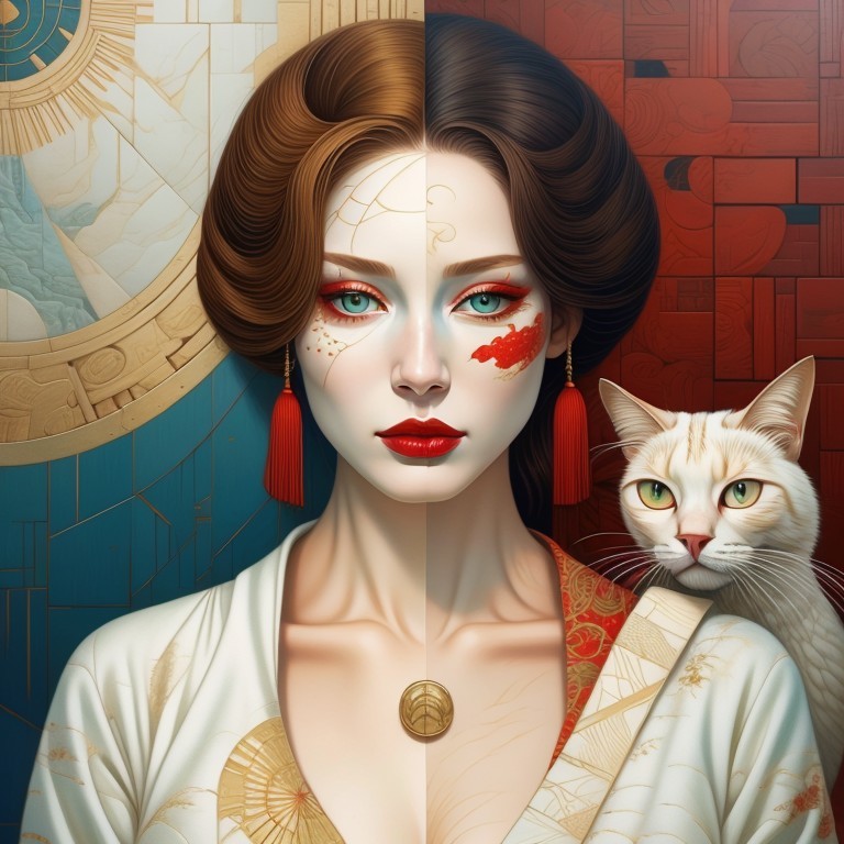 Illustration of a stylized woman with blue eyes, ornate attire, red accents, and a circular halo-like background.