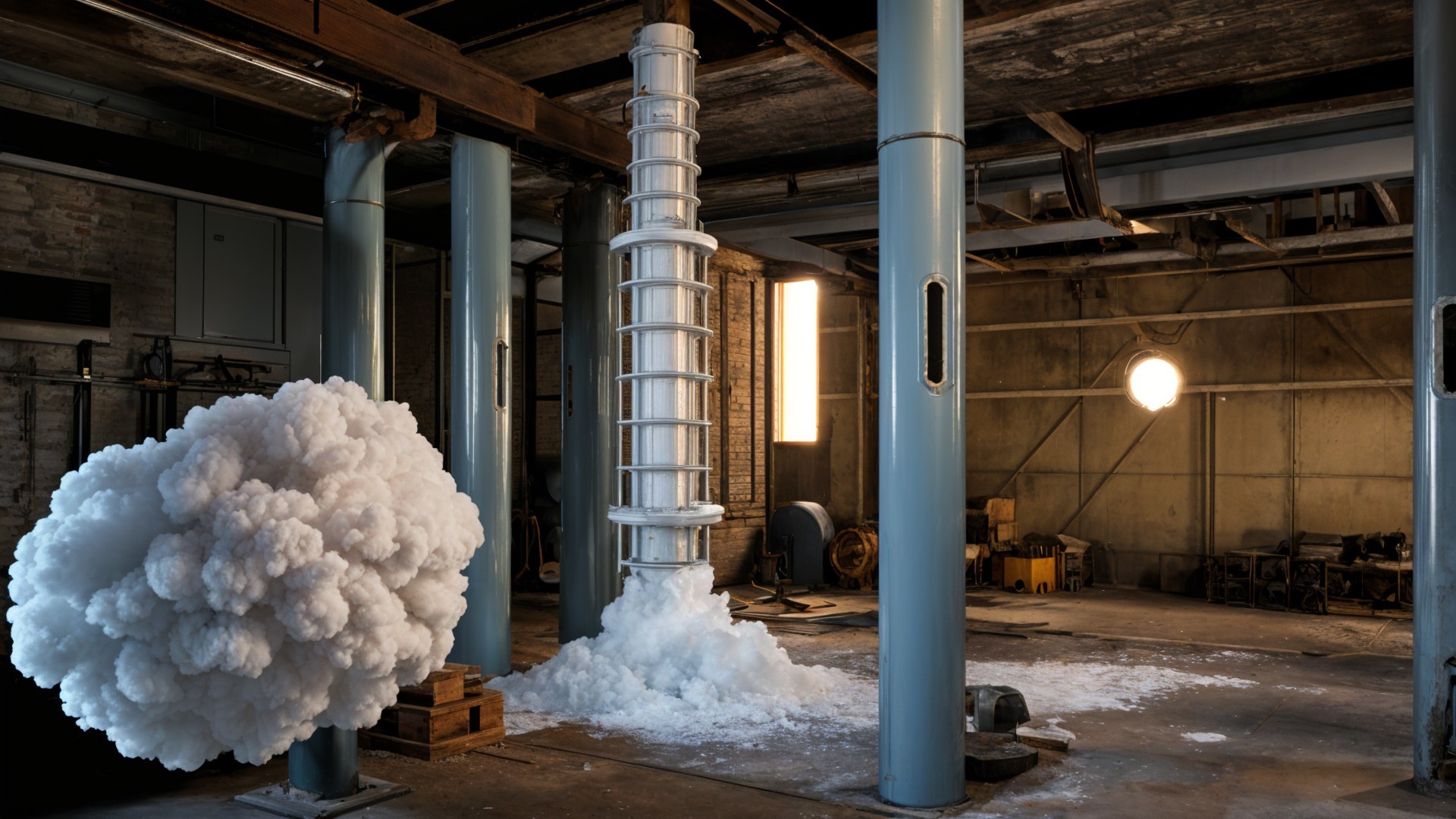 In a large industrial warehouse, workers in hard hats manage a spiraling apparatus surrounded by large, fluffy foam clouds, indicating an active manufacturing or processing operation.