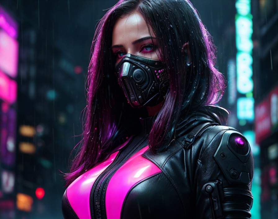 A woman wearing a futuristic mask and black jacket stands in the rain with neon city lights in the background.