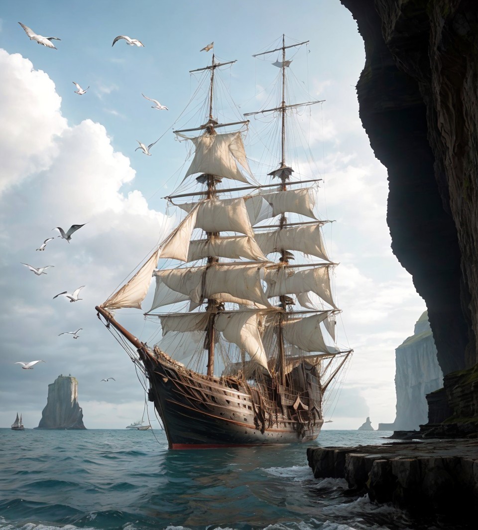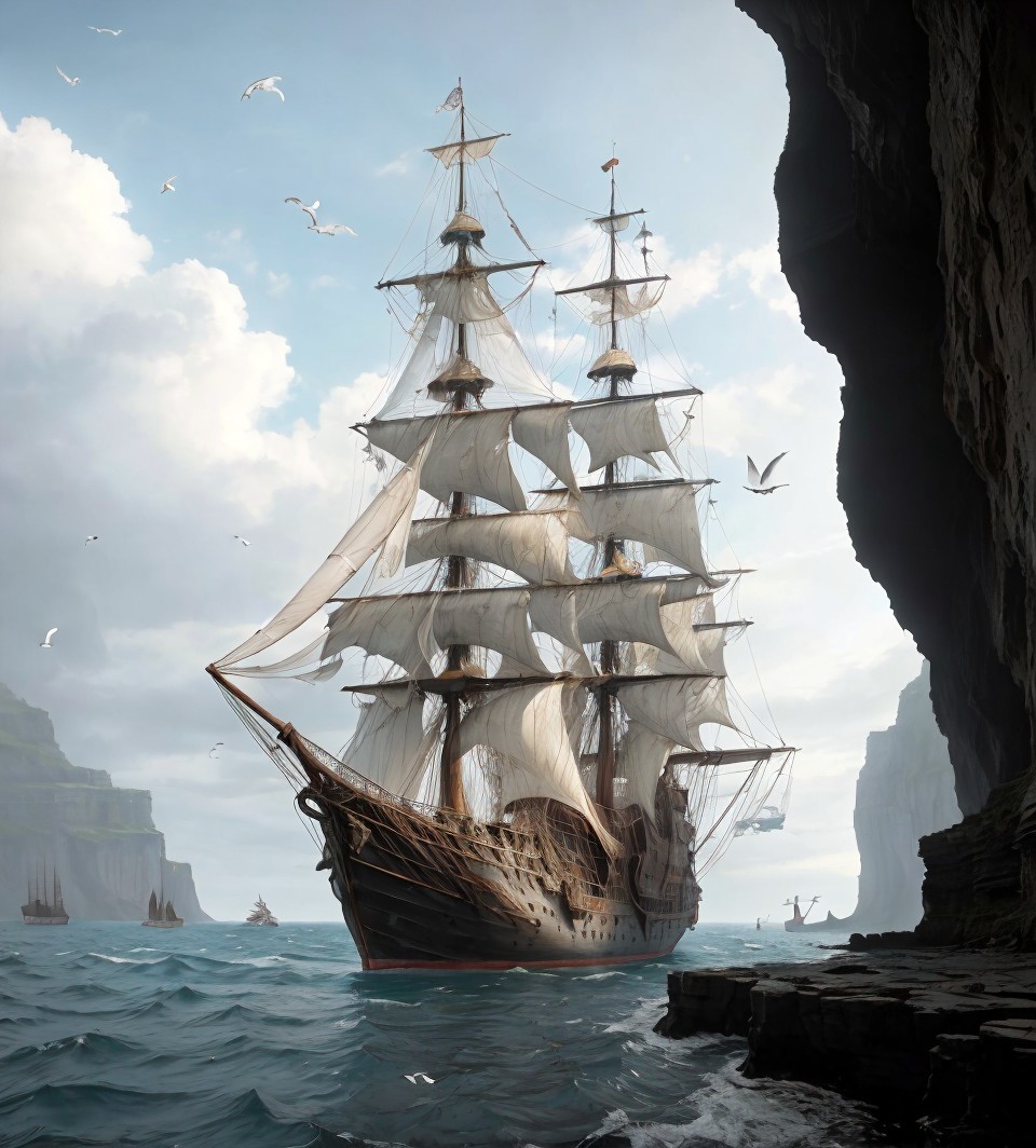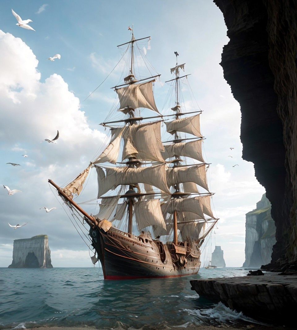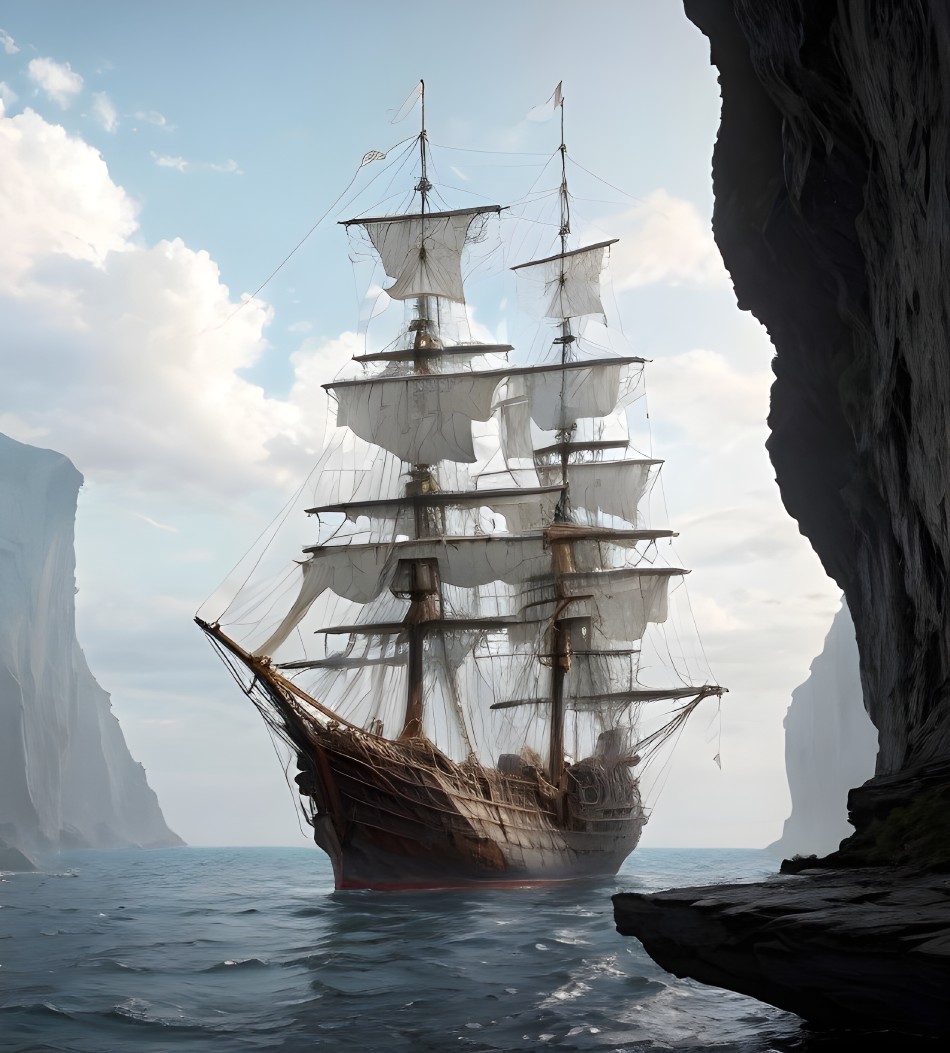 Floating near the shelter of the cliffs, an old weather galleon lies low in the water, masts are cracked with tattered sails, barely making it into the harbor.