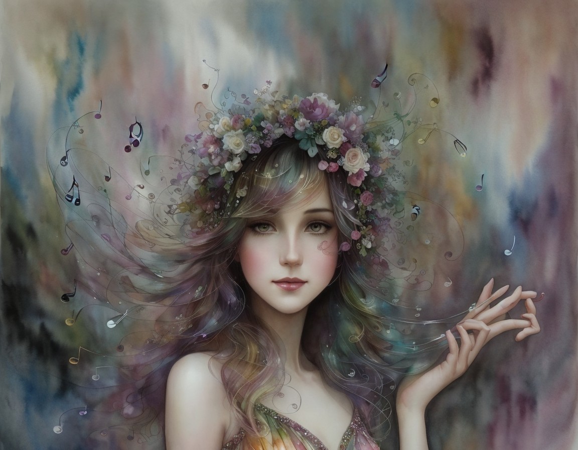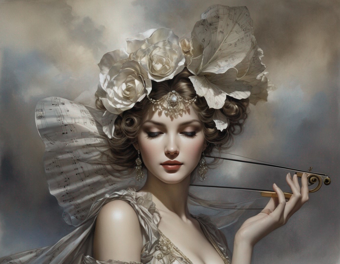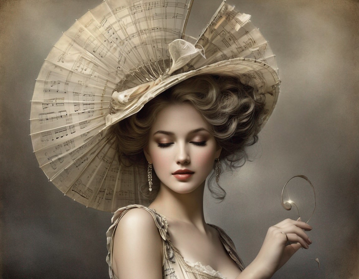 An elegant woman wearing a vintage musical notated hat closed eyes with a serene expression.