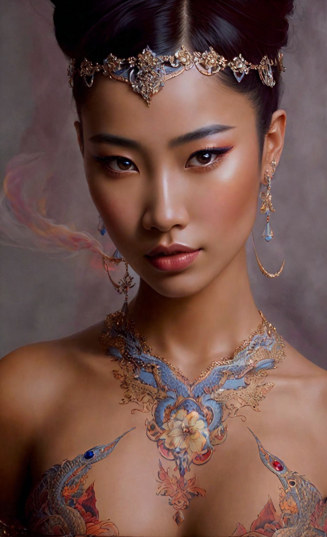 gorgeous dragon-queen Asian model, smooth and realistic portrait, smooth and intricate, high definition, realistic, clear and detailed eyes, hi-res, photorealistic, Nikon Z9, 85mm F1.2, DOF, smooth and realistic, dragonesque, illustrative digital painting, wispy coloured smoke, naga, sensual, seductive stare