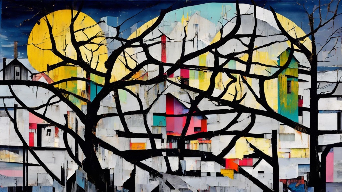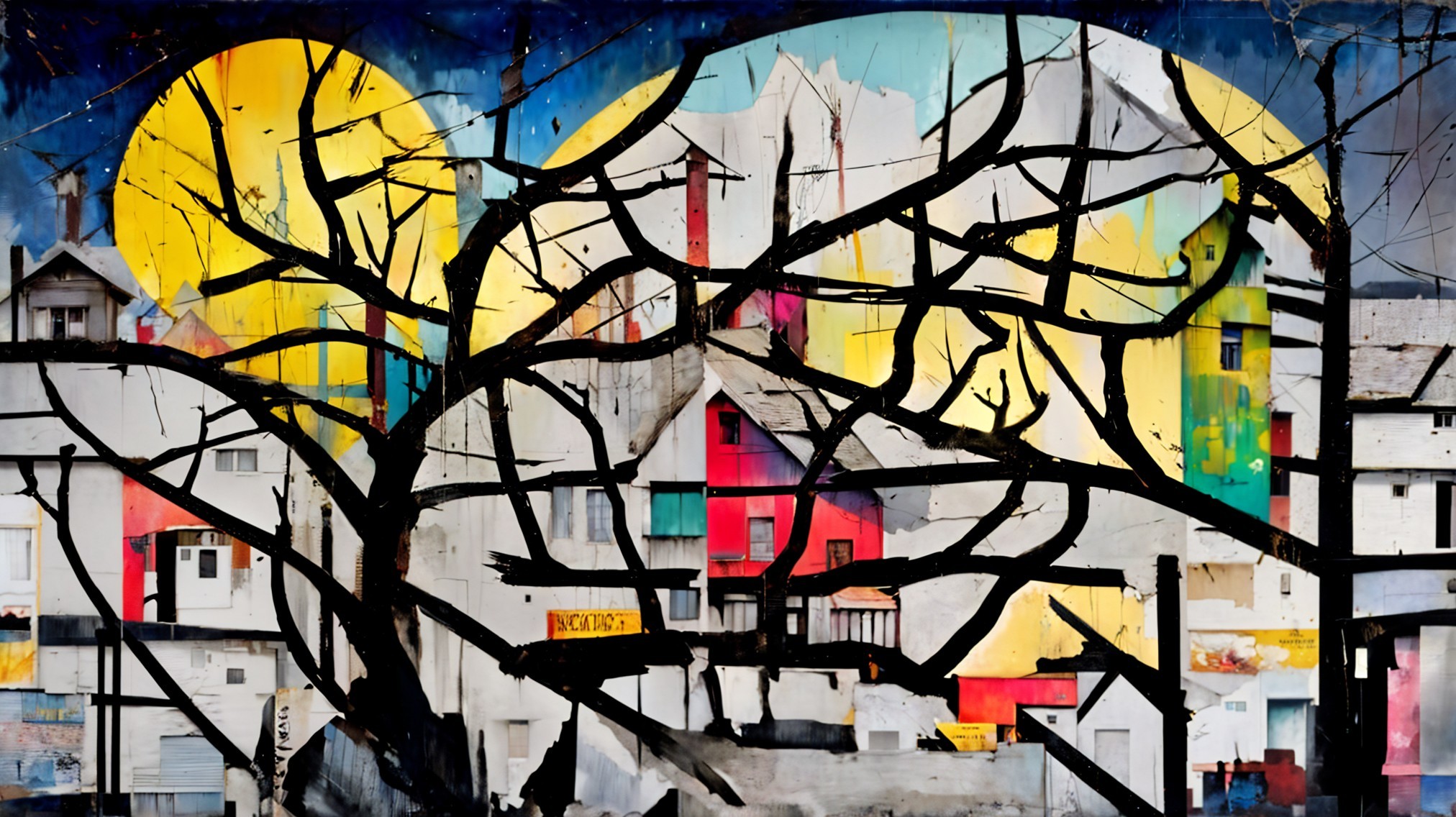 A vivid collage depicting colorful houses in a whimsical neighborhood, framed by dark, abstract tree branches. Silhouettes of people and animals add depth to this artistic landscape.