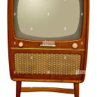 A vintage television with spider-like legs sits on a city street, displaying a cartoonish creature with exaggerated features, creating a surreal and whimsical atmosphere.
